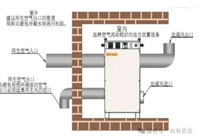 除濕機置于室外:干空氣出口和處理空氣進口連接到除濕區域。再生風入口和濕空氣出口不需要連接管道。